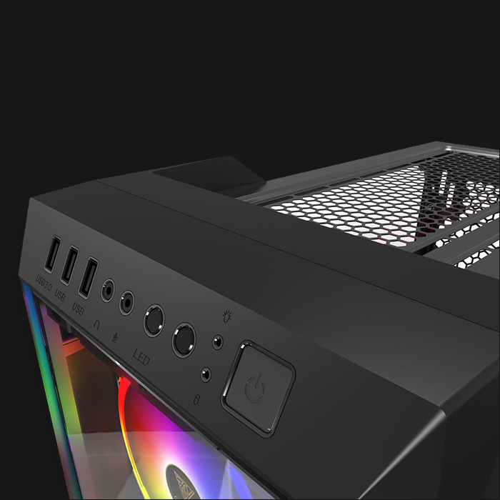 TALOS M1 ELITE, mid –tower case with front trapezoidal tempered glass panel and three eye-catching RGB lighting trio ring fans. Sleek tempered glass panels fully display all components and lead the user to a brand new modding experience!